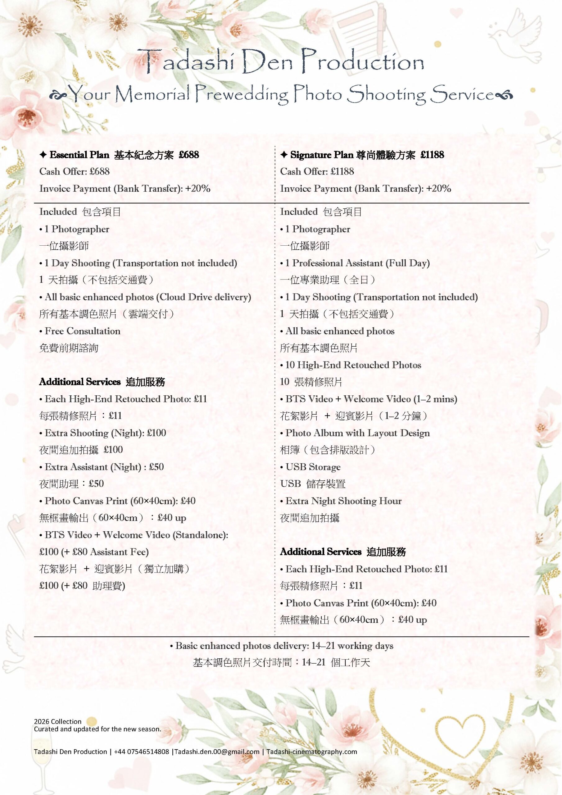 - Outdoor shooting (exclude £100 from package price if not needed)